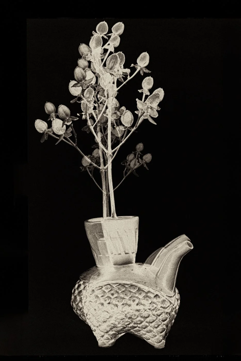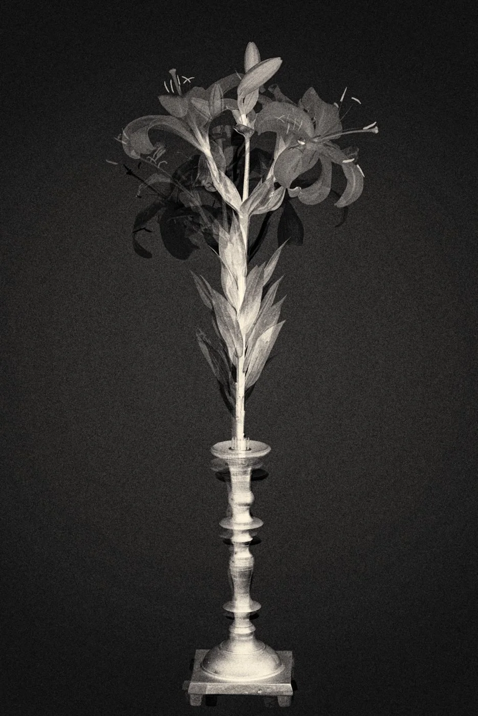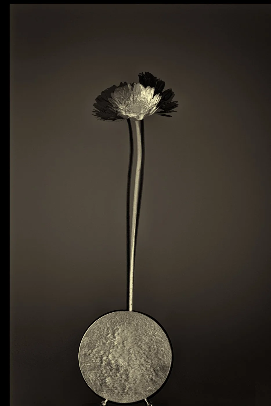 The unexpected stillness of the Covid-19 pandemic echoed the self-contained world of my childhood artmaking. Turning my attention to the real flowers that arrived with grocery deliveries, I rediscovered the profound joy of experimenting with color, backgrounds, and composition, which became a vital form of escape and a way to process my solitude. Printing these photographs and arranging them in my studio evoked the same sense of fulfillment I experienced as a child “planting” my walls with crayon drawings. Eventually, I began visualizing them not just as pictures but as dimensional sculptures: a flower in a grandfather clock's round face, with pendulum stems or a flower in a cumulus cloud. The magic is seeing your flower in your mind’s eye, the excitement of the beginning. The science is standing back and thinking how to make it real, how to get the long stem to balance on the candlestick.