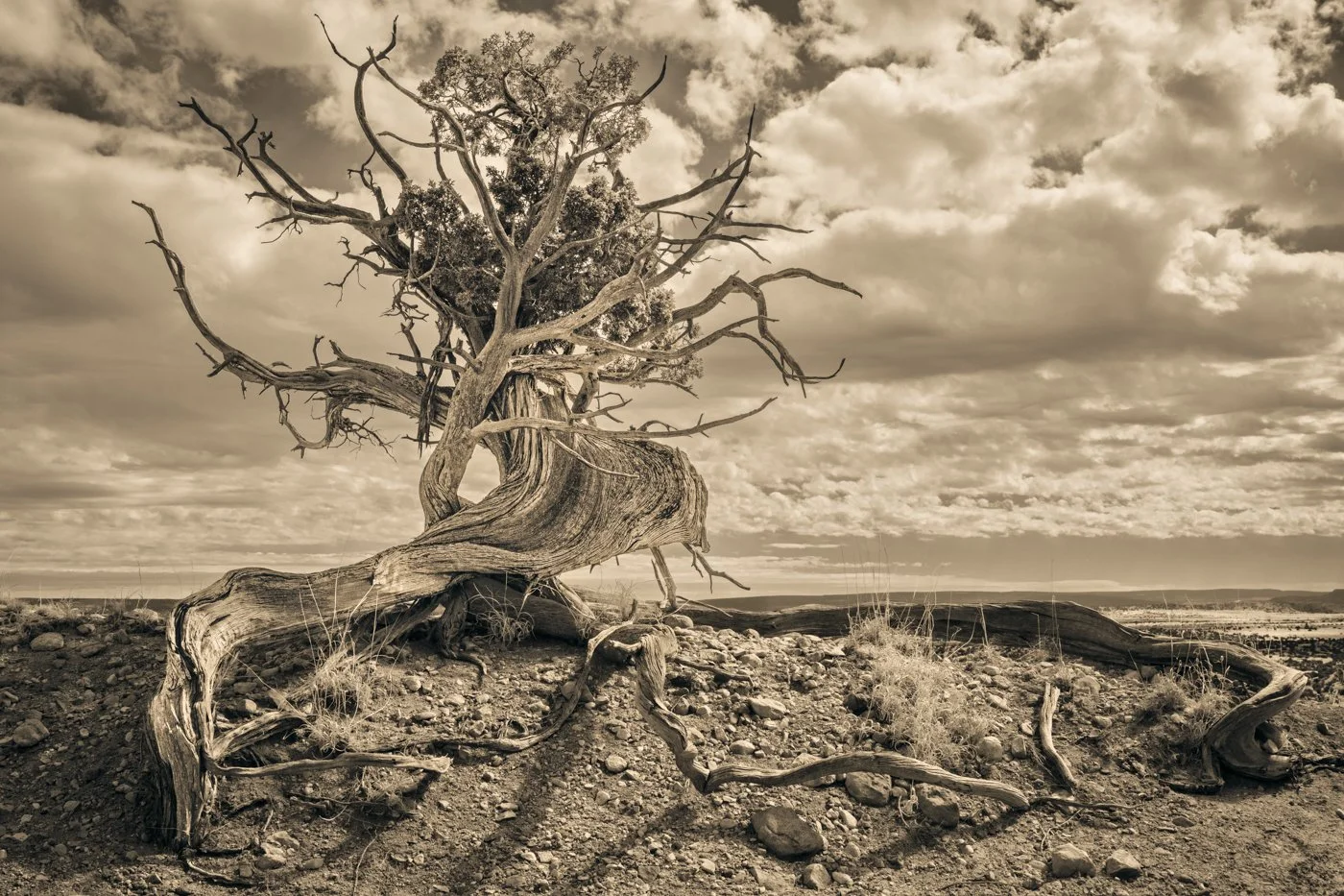 I’ve never been in a place where such distinct forms occupy the land. The arroyo is cut into the desert by flash floods, making it flatter than surrounding hilly terrain. This lends itself to walking and pausing at what catches your eye. The southwestern light is brilliant, and the meandering shadows of cottonwood branches on the ground are as dimensional as the trees themselves. On closer look, the whirl of the bark, the feet that support its trunk, the sinuous grain of wood worn by the elements reveal unexpected organizational elements.The trunks, branches, and roots of dead junipers stand like pieces of sculpture, often with twisted arms, torsos, and legs that suggest the human form. In a dying gesture, their bare branches and roots extend on the ground along the arroyo wall, suggesting some lasting design in nature.